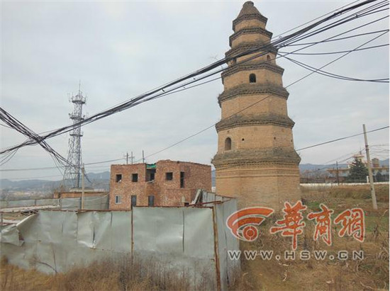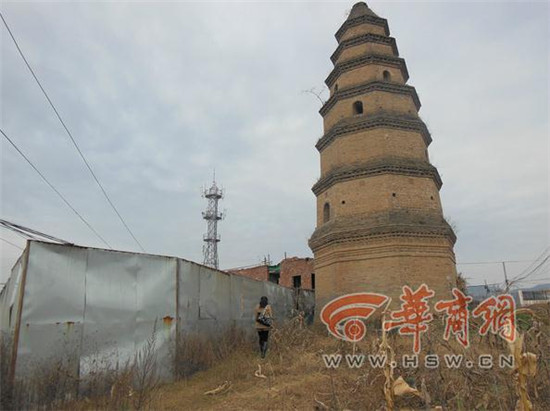 這座明代古塔位于商州區(qū)中學(xué)的后坡上,塔前的空地上建成二層磚房,房前的院子用一人多高的鐵皮圍著。這座房屋和院子占地將近500平方米,圍墻距離古塔最近處不到一米,可以明顯看到古塔的地基裸露。