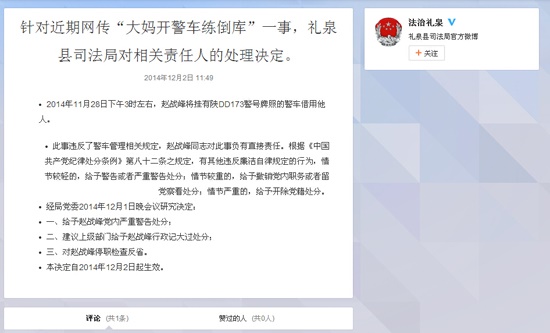李明介紹,根據(jù)《中國共產(chǎn)黨紀律處分條例》第八十二條規(guī)定,縣紀委研究決定:對趙戰(zhàn)峰停職檢查反省,給予其行政記大過處分和黨內(nèi)嚴重警告處分;給予禮泉縣司法局局長王大平和黨委書記王鵬飛警示訓(xùn)誡處理。同時,縣紀委將就趙戰(zhàn)峰公車私用一事在全縣范圍通報批評,以杜絕此類事件再次發(fā)生。(記者 馬新斌)