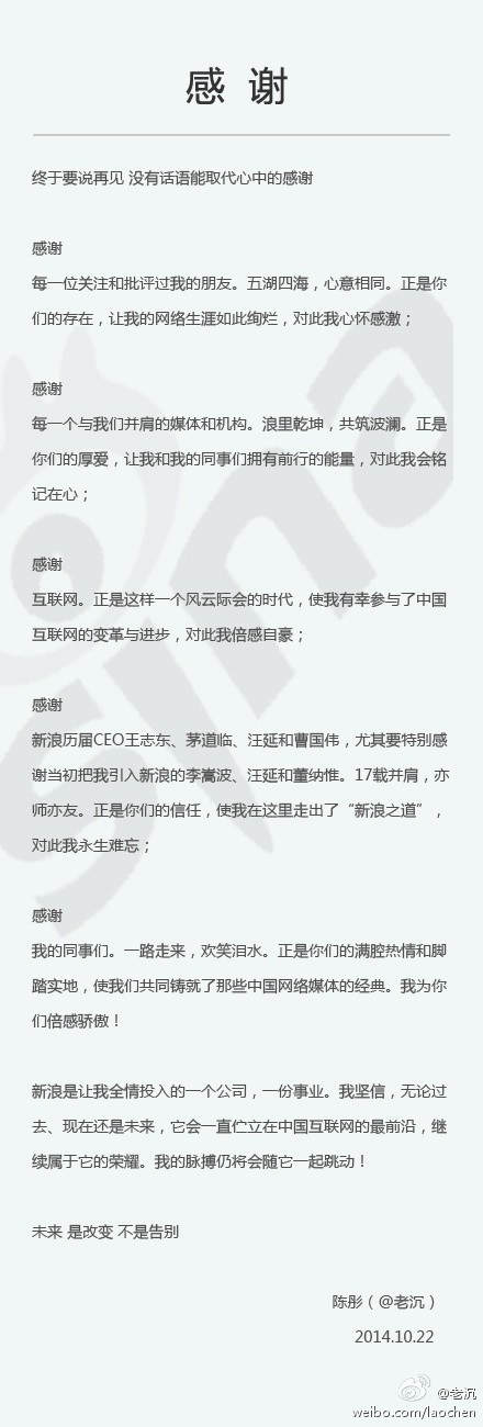 鳳凰科技訊 10月22日消息,新浪執(zhí)行副總裁、新浪網(wǎng)總編輯陳彤今日在微博中透露,將因個(gè)人原因辭職。
