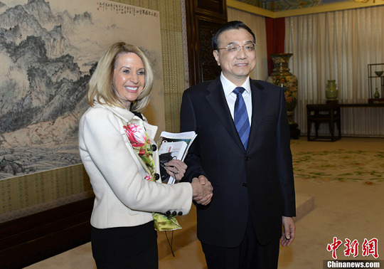 2014年1月13日,中國(guó)國(guó)務(wù)院總理李克強(qiáng)在北京中南海紫光閣會(huì)見了美國(guó)《科學(xué)》雜志主編瑪西婭·納特一行。(資料圖)中新社發(fā) 劉震 攝
