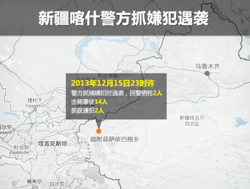 新疆喀什15日發(fā)生暴力恐怖襲擊事件。據(jù)了解,12月15日23時許,新疆喀什地區(qū)疏附縣民警在薩依巴格鄉(xiāng)進行入戶排查時,突遭多名暴徒投擲爆炸裝置并持砍刀襲擊,造成2名民警犧牲。在警告無效的情況下,警方擊斃暴徒14人,當場抓獲犯罪嫌疑人2名。此次事件距離喀什巴楚縣的暴力恐怖襲擊案件整整一個月,也是喀什今年發(fā)生的第三次暴恐事件。