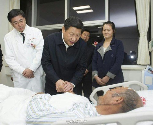 兩天來,習(xí)近平一直關(guān)注著事故搶險(xiǎn)工作,惦記著在事故中受到損失的群眾。24日下午,習(xí)近平一抵達(dá)青島,就在山東省委書記姜異康、省長郭樹清陪同下,來到青島大學(xué)附屬醫(yī)院黃島分院,看望慰問傷員、醫(yī)護(hù)人員和遇難者家屬。他走進(jìn)病房,先后來到受傷群眾姜瑞芬、薛淑美、徐之泰、孫桂山病床前,同他們親切握手,仔細(xì)查看傷情,鼓勵(lì)他們配合治療、安心養(yǎng)病。習(xí)近平同醫(yī)療專家代表一一握手,肯定他們關(guān)鍵時(shí)刻迅速行動(dòng)、連續(xù)作戰(zhàn)、不怕疲勞的救死扶傷精神,希望他們勞逸結(jié)合、科學(xué)調(diào)度、再接再厲,確保每個(gè)傷員都得到精心治療。習(xí)近平在看望遇難者家屬時(shí),對他們親屬的不幸遇難表示哀悼,希望他們節(jié)哀制痛、樹立生活信心,表示黨和政府一定會(huì)盡最大努力安排好大家工作生活。他要求有關(guān)部門要一家一家把善后工作做細(xì)做實(shí)。