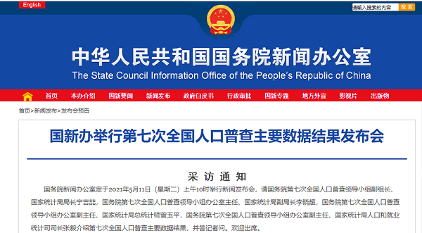 國務院新聞辦公室定于2021年5月11日(星期二)上午10時舉行新聞發(fā)布會,請國務院第七次全國人口普查領導小組副組長、國家統(tǒng)計局局長寧吉喆,國務院第七次全國人口普查領導小組辦公室主任、國家統(tǒng)計局副局長李曉超,國務院第七次全國人口普查領導小組辦公室副主任、國家統(tǒng)計局總統(tǒng)計師曾玉平,國務院第七次全國人口普查領導小組辦公室副主任、國家統(tǒng)計局人口和就業(yè)統(tǒng)計司司長張毅介紹第七次全國人口普查主要數(shù)據(jù)結果,并答記者問。