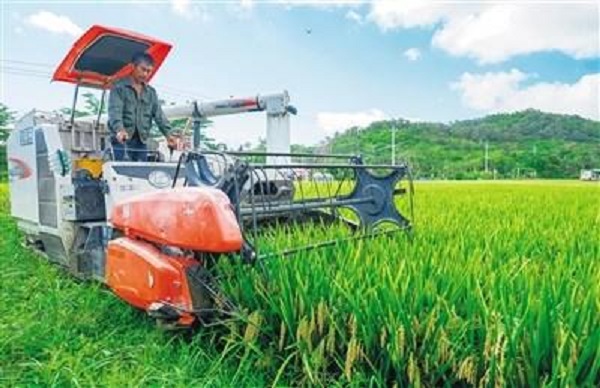 5月9日上午,在三亞國家水稻公園示范點(diǎn),聯(lián)合收割機(jī)在收割“超優(yōu)千號(hào)”超級(jí)雜交水稻。此次收割測(cè)得“超優(yōu)千號(hào)”早造平均畝產(chǎn)1004.83公斤,較設(shè)計(jì)預(yù)測(cè)畝產(chǎn)量多了100余公斤。 本報(bào)記者 武威 攝