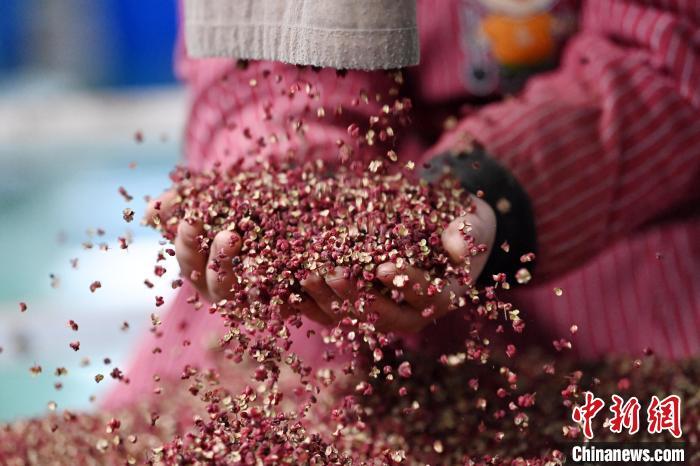 2024年3月17日,在甘肅省天水市甘谷縣一加工企業(yè)內(nèi),工作人員檢查初篩的花椒。(資料圖)九美旦增 攝