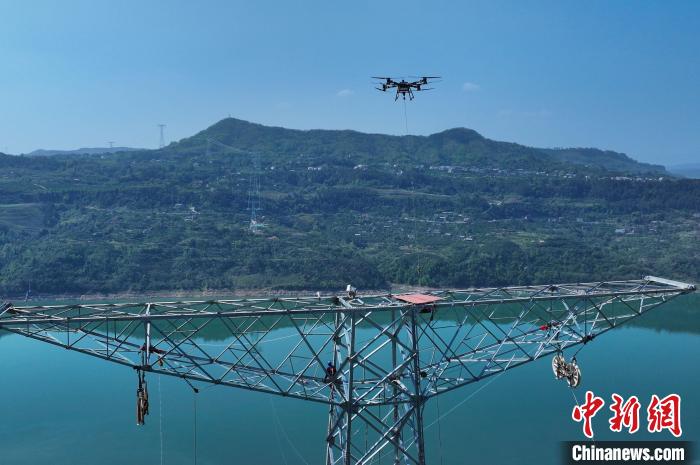 中新網(wǎng)重慶4月7日電(記者 周毅)7日,在重慶萬州金上至湖北±800千伏特高壓直流輸電工程(渝2標段)跨江放線作業(yè)現(xiàn)場,一臺大載重無人機搭載著一級導引繩從N5193號鐵塔附近騰空而起,跨越935米的江面,飛向長江對岸N5192號鐵塔作業(yè)人員手中,此次長江兩岸鐵塔的成功“牽手”,是中國西南地區(qū)首次應用大載重無人機參與特高壓工程放線作業(yè)。