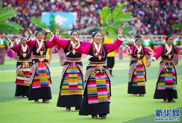8月26日,日喀則農(nóng)牧民群眾演員身著特色民族服飾在開幕式上表演。新華社記者 劉東君 攝