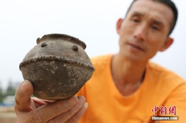 資料圖:帶有腰帶紋的仰韶文化時(shí)期的小黑陶罐。中新社發(fā) 楊正華 攝