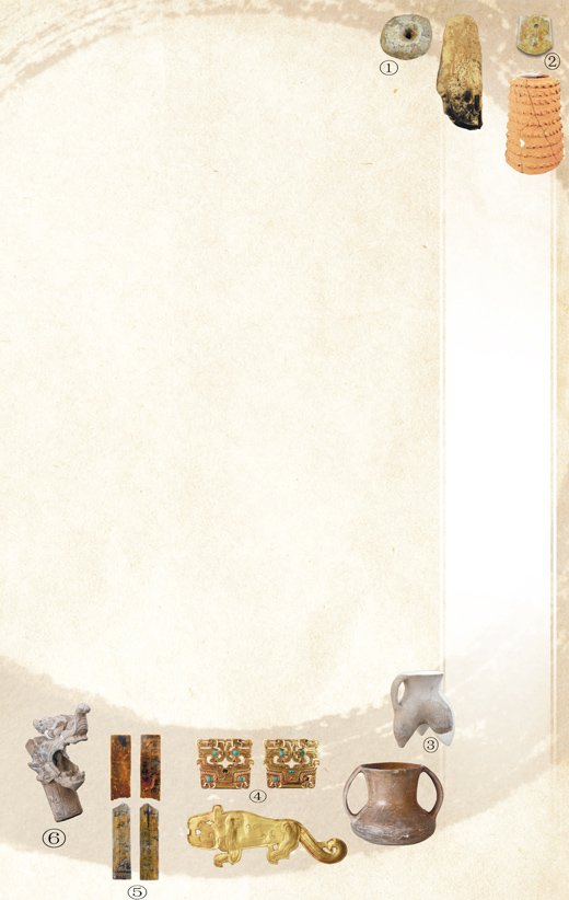 圖②:湖北沙洋縣城河新石器時(shí)代遺址出土的石鉞、陶筒形器。