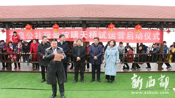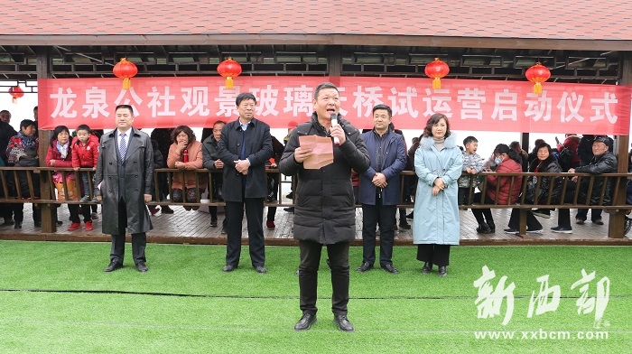 涇陽龍泉公社觀景玻璃天橋項(xiàng)目總經(jīng)理張明吉在試運(yùn)營(yíng)啟動(dòng)儀式上致辭。他說:“我們龍泉公社以黨的十八大、十九大精神為指引,按照新時(shí)代文化繁榮發(fā)展的新要求,因地制宜,立足地方特色文化,不斷豐富旅游文化內(nèi)涵,進(jìn)一步拓展旅游產(chǎn)業(yè)發(fā)展空間,做大做強(qiáng)文化旅游產(chǎn)業(yè),打造更多精品旅游景點(diǎn),目前已建成開業(yè)試運(yùn)營(yíng)的龍泉公社玻璃天橋就是其中之一,今年3月初將在玻璃天橋出口處建造400米長(zhǎng)的玻璃滑道;在玻璃天橋西側(cè)建造七彩滑道場(chǎng),這兩個(gè)項(xiàng)目于‘五·一’隆重開業(yè),在玻璃天橋西側(cè)臨坡溝壑處建造大型滑雪場(chǎng)一座,集滑雪、戲雪為一體,預(yù)計(jì)11月份開業(yè)運(yùn)營(yíng),同時(shí)年底動(dòng)工建造山地小火車??傊褪浅浞掷谬埲馁Y源優(yōu)勢(shì),給大家創(chuàng)造更多休閑娛樂場(chǎng)所,希望能給朋友們帶來更多的快樂!”