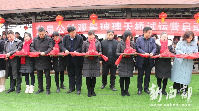 新西部網(wǎng)西安1月24日電(記者王順利 時(shí)敏)今天上午,涇陽龍泉公社觀景玻璃天橋入口處鑼鼓喧天、氣球高懸,人聲鼎沸、熱鬧非凡,涇陽龍泉公社觀景玻璃天橋試運(yùn)營(yíng)啟動(dòng)儀式在這里隆重舉行。涇陽縣文體廣電局、文物旅游局、電視臺(tái)、安吳鎮(zhèn)等部門負(fù)責(zé)人,龍泉公社玻璃天橋項(xiàng)目總經(jīng)理張明吉,龍?jiān)创妩h支部書記、龍泉公社董事長(zhǎng)劉煒等共同為玻璃天橋試運(yùn)營(yíng)剪彩。