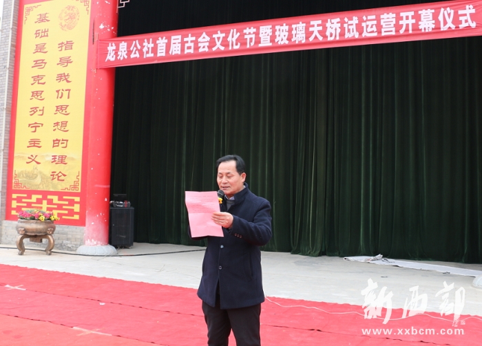 龍泉公社首屆古會(huì)文化節(jié)今天同時(shí)啟動(dòng),龍泉公社副總經(jīng)理朱印平為首屆古會(huì)文化節(jié)致辭,他說:“憶往昔崢嶸歲月稠,展未來百舸爭(zhēng)流急。值此辭舊迎新之際,我謹(jǐn)代表龍泉公社董事長(zhǎng)劉煒先生,代表龍泉公社全體員工,向今天參加龍泉公社首屆古會(huì)文化節(jié)暨玻璃天橋試運(yùn)營(yíng)啟動(dòng)儀式的所有嘉賓表示最熱烈的歡迎并致以最誠(chéng)摯的問候,同時(shí)也對(duì)長(zhǎng)期以來關(guān)心支持龍泉公社發(fā)展的各界人士表示最衷心的感謝!”