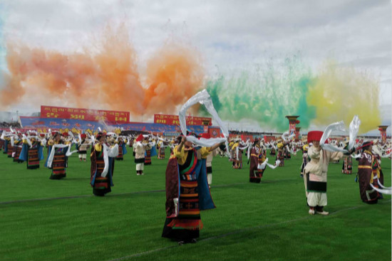 開(kāi)幕式演出中,除當(dāng)?shù)貙W(xué)生、群眾,格薩爾說(shuō)唱藝人等1144名演員外,還有260匹馬、100頭牦牛、200只綿羊參演,同時(shí)還進(jìn)行了傳統(tǒng)馬術(shù)表演,充分展現(xiàn)了藏北羌塘草原文化特色。