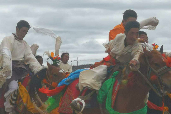 來(lái)自那曲市11個(gè)縣區(qū)的近萬(wàn)名各族群眾身著節(jié)日盛裝齊聚賽馬場(chǎng),參加一年一度的賽馬節(jié)。