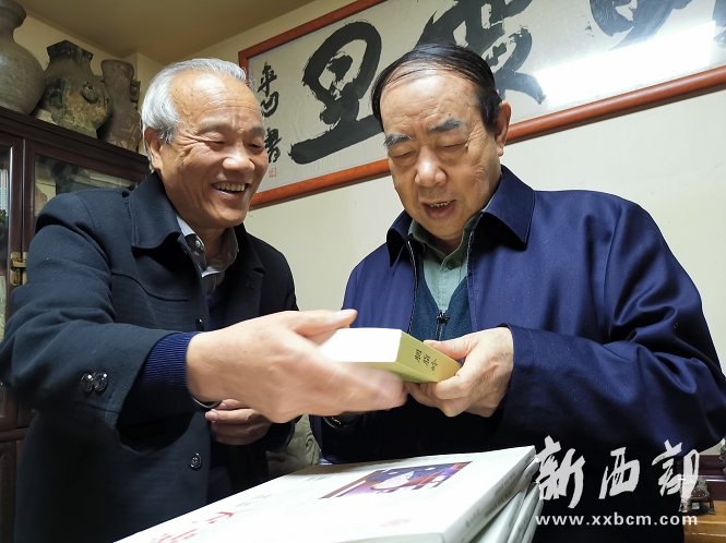 ▲李印功給賈平凹(右)贈(zèng)送長(zhǎng)篇小說(shuō)《胭脂嶺》。