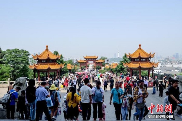 資料圖:游客在黃鶴樓游玩。 張暢 攝