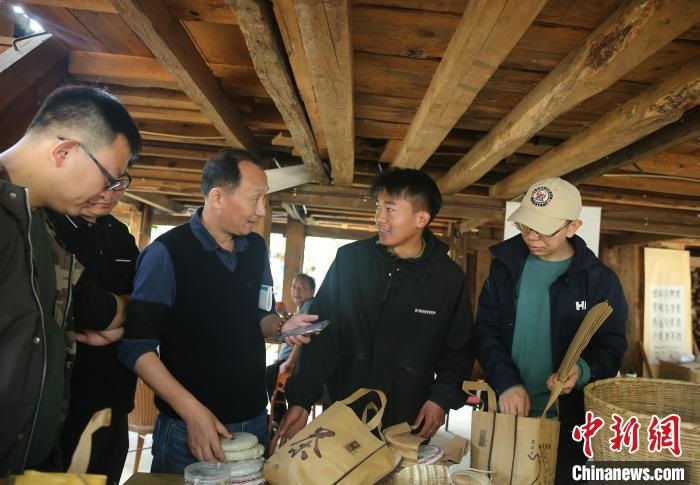 12月1日,景邁山景邁村傣族村民巖共往(右二)向客人推薦自家茶葉。中新社記者 黃興鴻 攝