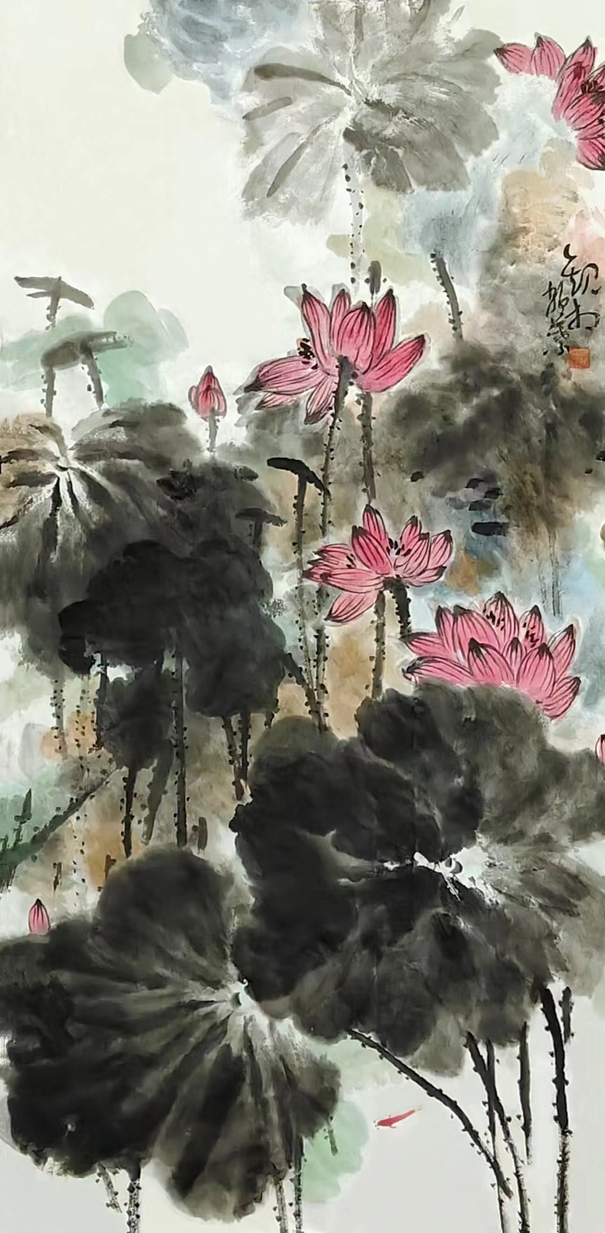 靜葉的禪意墨荷,現(xiàn)實(shí)與虛境共鳴,生活與禪意共生。就如沉潛在城市鋼鐵叢林中的小木屋,不宏偉,不器宇巍峨,僅是一泓清澈的泉水,但甘甜如飴。其用畫作凈化心靈,澡雪精神,剝離披在靈魂上的污垢。