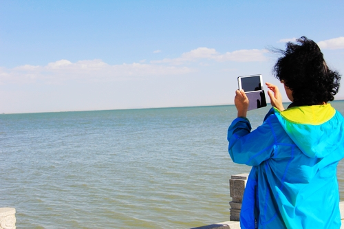 一名游客正在用手機拍攝美麗的可魯克湖景色