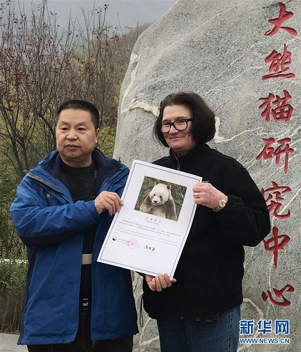 11月20日,陜西省林業(yè)科學(xué)院秦嶺大熊貓繁育研究中心副主任高更更(左)和熊貓國際負(fù)責(zé)人蘇珊·布雷登簽署棕色大熊貓“七仔”認(rèn)養(yǎng)協(xié)議。新華社發(fā)(陜西省林業(yè)科學(xué)院秦嶺大熊貓繁育研究中心提供)
