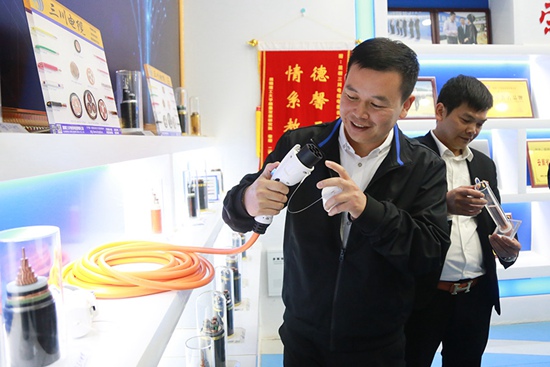 昆明三川電線電纜有限公司負(fù)責(zé)人向記者介紹公司產(chǎn)品。 李發(fā)興攝