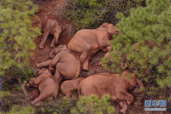6月13日在云南省玉溪市易門縣十街鄉(xiāng)拍攝的象群(無(wú)人機(jī)照片)。新華社發(fā)
