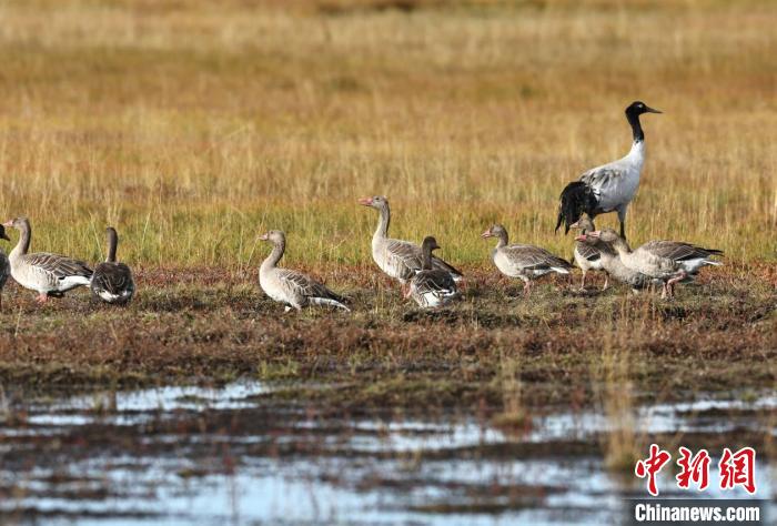圖為灰雁與黑頸鶴在甘肅黃河首曲國(guó)家級(jí)自然保護(hù)區(qū)內(nèi)集群。 甘肅省林草局供圖.