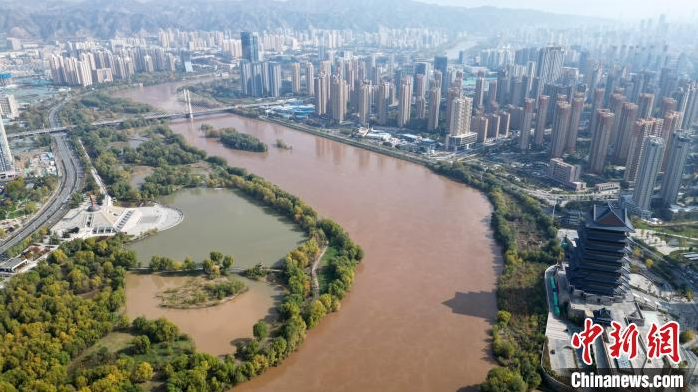 2024年10月31日,黃河甘肅蘭州段與兩岸的斑斕秋色相映成趣。(無人機(jī)照片)九美旦增攝