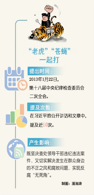 “要堅持‘老虎’‘蒼蠅’一起打,既堅決查處領導干部違紀違法案件,又切實解決發(fā)生在群眾身邊的不正之風和腐敗問題?!?013年1月,習近平在十八屆中央紀委二次全會上提出了這一關(guān)于反腐的具體要求。