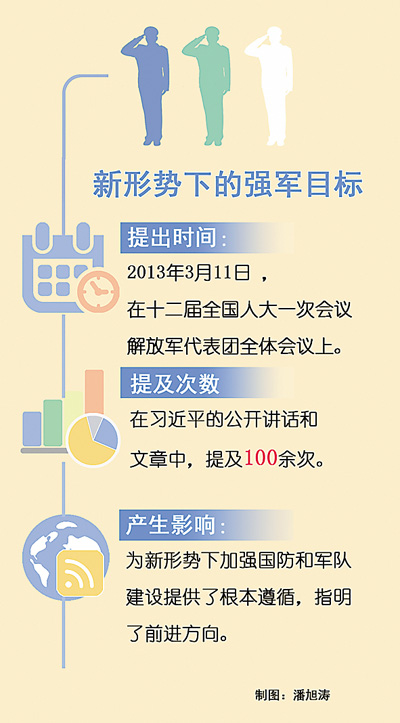 3年前,習(xí)近平在十二屆全國(guó)人大一次會(huì)議解放軍代表團(tuán)全體會(huì)議上提出:建設(shè)一支聽(tīng)黨指揮、能打勝仗、作風(fēng)優(yōu)良的人民軍隊(duì),是黨在新形勢(shì)下的強(qiáng)軍目標(biāo)。據(jù)不完全統(tǒng)計(jì),3年來(lái),在習(xí)近平公開(kāi)講話和文章當(dāng)中,提及強(qiáng)軍目標(biāo)100多次。黨在新形勢(shì)下的強(qiáng)軍目標(biāo)為加強(qiáng)國(guó)防和軍隊(duì)建設(shè)提供了根本遵循。