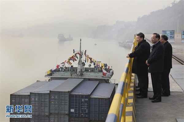 4日下午,習近平來到兩江新區(qū)果園港。果園港是正在建設(shè)的第三代現(xiàn)代化內(nèi)河港口、國家級鐵路公路水路多式聯(lián)運綜合交通樞紐。習近平聽取長江上游航運中心建設(shè)、現(xiàn)代化港口群布局、鐵路公路水路聯(lián)運、渝新歐國際鐵路開行等情況介紹,了解重慶推動長江經(jīng)濟帶發(fā)展和“一帶一路”建設(shè)、擴大內(nèi)陸地區(qū)開放開發(fā)以及功能區(qū)生態(tài)文明建設(shè)情況。他指出,“一帶一路”建設(shè)為重慶提供了“走出去”的更大平臺,推動長江經(jīng)濟帶發(fā)展為重慶提供了更好融入中部和東部的重要載體,重慶發(fā)展?jié)摿薮?、前景光明。得知渝新歐班列運營情況良好,習近平很高興,要求重慶完善各個開放平臺,建設(shè)內(nèi)陸國際物流樞紐和口岸高地,建設(shè)內(nèi)陸開放高地。