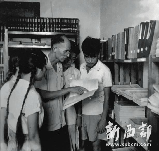 1959年,沈尚賢教授(中)與青年助教一起翻閱蘇聯(lián)高??蒲匈Y料