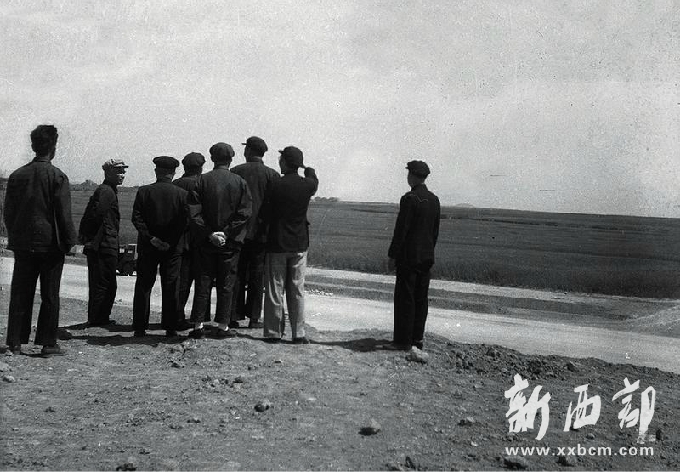 5月10日,交通大學校長彭康和五位教授再次踏勘校區(qū)。西遷館有兩幅照片反映了這一時點,一幅是他們行走在麥田中,一幅是駐足于麥田,擘畫學校的未來。