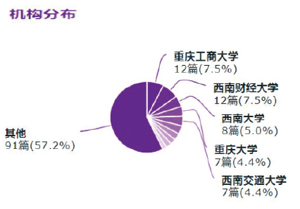 2、樣本分析。一是主要研究機構(gòu)。評價各研究機構(gòu)在該領(lǐng)域影響力的一個極為重要的指標(biāo),即發(fā)文量。通過分析成渝城市群協(xié)調(diào)發(fā)展相關(guān)文獻發(fā)表機構(gòu)的發(fā)文總量,在一定程度上可以反映成渝城市群協(xié)調(diào)發(fā)展研究情況以及各機構(gòu)研究的學(xué)術(shù)水平高低。按照文獻所屬機構(gòu)劃分,將有7篇以上刊文量的6個機構(gòu)情況繪制成圖1。從圖1可以看出,成渝城市群協(xié)調(diào)發(fā)展相關(guān)研究主要在高校中開展,但范圍比較局限,主要集中在西南地區(qū)部分高校。從發(fā)文數(shù)量可以看出各高校研究程度差異較小,刊文量在7篇以上的有5所高校,該領(lǐng)域高校研究呈現(xiàn)均衡發(fā)展但都對于相關(guān)研究較少。其中,部分高校在該領(lǐng)域的研究論文數(shù)量僅1篇或者為0。由于深入研究成渝城市群協(xié)調(diào)發(fā)展的學(xué)者較少,且彼此之間聯(lián)系較弱,在該研究領(lǐng)域的發(fā)文機構(gòu)聯(lián)系也不太緊密。綜合看來,對成渝城市群協(xié)調(diào)發(fā)展開展研究的機構(gòu)主要集中在西南地區(qū),特別是四川和重慶高校。