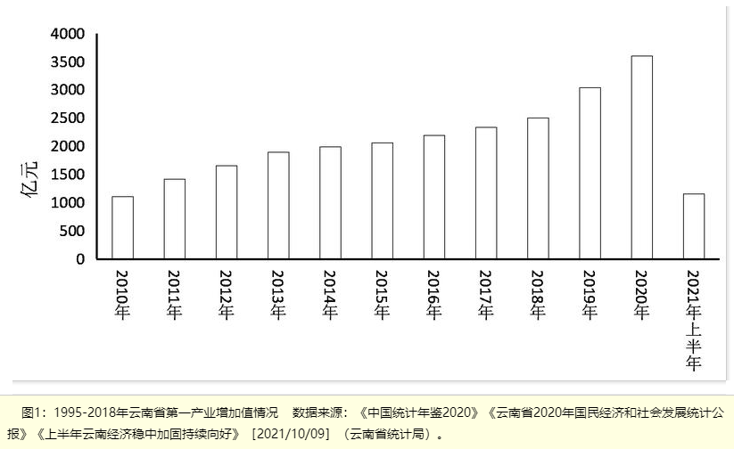 黨的十八大以來(lái),云南第一產(chǎn)業(yè)持續(xù)快速發(fā)展。2012-2020年間,第一產(chǎn)業(yè)產(chǎn)值從1654.55億元增長(zhǎng)到3598.91億元,增長(zhǎng)了1.18倍,年均增長(zhǎng)10.2%,年均增幅比全國(guó)高出4.96個(gè)百分點(diǎn)。2021年上半年,云南第一產(chǎn)業(yè)增加值1146.48億元,同比增長(zhǎng)8.8%,兩年平均增長(zhǎng)5.3%,同比增長(zhǎng)和兩年平均增長(zhǎng)均比全國(guó)高出1個(gè)百分點(diǎn),[1]詳見圖1。
