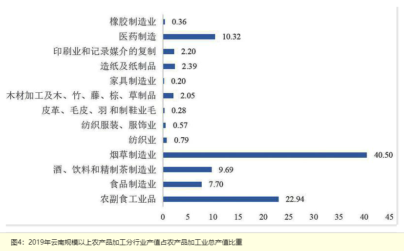 黨的十八大以來(lái),云南農(nóng)產(chǎn)品加工業(yè)持續(xù)快速發(fā)展,結(jié)構(gòu)不斷優(yōu)化,農(nóng)產(chǎn)品加工業(yè)區(qū)域集群化效益逐步顯現(xiàn),帶動(dòng)了各類農(nóng)產(chǎn)品生產(chǎn)產(chǎn)業(yè)的發(fā)展,農(nóng)產(chǎn)品加工產(chǎn)業(yè)體系基本建立,有效提升了農(nóng)業(yè)產(chǎn)業(yè)體系發(fā)展水平和質(zhì)量。2012-2019年,云南規(guī)模以上農(nóng)產(chǎn)品加工業(yè)總產(chǎn)值從2562.48億元增加到4006.25億元,增長(zhǎng)了56.34%,年均增長(zhǎng)5.74%,農(nóng)產(chǎn)品加工業(yè)總產(chǎn)值占制造業(yè)總產(chǎn)值的比重始終保持在35%以上,2016年達(dá)到最高為43.03%,詳見圖3。其中,煙草制造業(yè)產(chǎn)值的比重從55.48%下降到40.5%、下降了14.98個(gè)百分點(diǎn);農(nóng)副食工業(yè)品發(fā)展較快,占農(nóng)產(chǎn)品加工業(yè)總產(chǎn)值比重從16.09%提高到了22.94%、提高了6.86個(gè)百分點(diǎn),逐漸成為另一支柱;食品制造業(yè)、酒、飲料和精制茶制造業(yè)、醫(yī)藥制造業(yè)等3個(gè)行業(yè)產(chǎn)值的比重分別為7.7%、9.69%和10.32%,分別比2012年提高了2.27個(gè)百分點(diǎn)、3.92個(gè)百分點(diǎn)和1.77個(gè)百分點(diǎn),詳見圖4。2019年與2012年相比,除了煙草制造業(yè)、印刷業(yè)和記錄媒介的復(fù)制的國(guó)內(nèi)市場(chǎng)占有率分別下降2.1和0.25個(gè)百分點(diǎn)以外,其余11個(gè)行業(yè)的國(guó)內(nèi)市場(chǎng)占有率均呈持續(xù)提高的發(fā)展趨勢(shì),其中酒、飲料和精制茶制造業(yè)、農(nóng)副食工業(yè)品、食品制造業(yè)增長(zhǎng)尤為明顯,分別提高了1.68個(gè)百分點(diǎn)、1.02個(gè)百分點(diǎn)、0.66個(gè)百分點(diǎn)。2020年,云南省納入國(guó)家目錄的家庭農(nóng)場(chǎng)5萬(wàn)余戶,依法登記的農(nóng)民專業(yè)合作社5.8萬(wàn)余個(gè),各類農(nóng)業(yè)產(chǎn)業(yè)化龍頭企業(yè)達(dá)4440家,[7]農(nóng)產(chǎn)品加工業(yè)區(qū)域集群化基本形成,西雙版納州、普洱市、臨滄市和保山市的茶葉加工占全省75.1%,昆明市、曲靖市、玉溪市和大理州的畜禽加工占全省71.7%,昆明市、楚雄州和玉溪市的蔬菜加工占全省61.7%,楚雄州、大理州、麗江市和迪慶州的食用菌加工占全省81%,昆明市、文山州和大理州的生物制藥加工占全省68.8%,臨滄市、德宏州和文山州的蔗糖加工占全省65.3%。云南農(nóng)產(chǎn)品加工總產(chǎn)值突破5000億元,農(nóng)產(chǎn)品加工產(chǎn)值與農(nóng)業(yè)總產(chǎn)值之比從2015年的0.64∶1[8]提高到2020年的1.8∶1。[9]