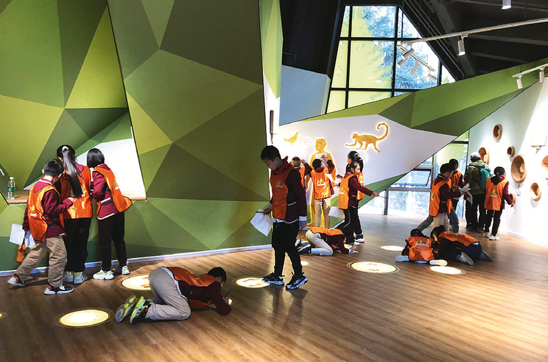 ▲在自然教育中心展示廳里,學(xué)生們正在進(jìn)行動物腳印分辨研學(xué)活動