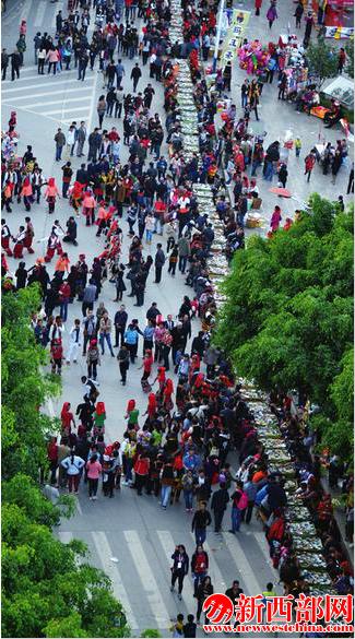 2004年舉辦的長街宴活動的桌數(shù)為2041桌,綿延2147米,創(chuàng)造了“世界最長宴席”紀錄,被譽為“天下第一宴”。為此,上?;崴箍偛窟€將其列入基尼斯之最名錄。之后,綠春長街古宴的桌數(shù)還不斷增多,最多的時候超過3000桌,綿延4公里,場面蔚為壯觀。