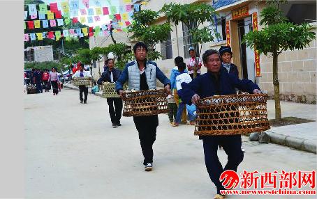扒出部分,堆在一起,然后又分發(fā)到各處去,這種混合在一起的菜肴,示意全寨人同心合力祭神迎龍頭來和大家共度佳節(jié)。