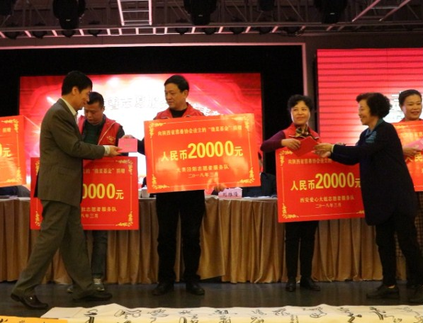 省慈善協會副會長、志愿者分會(總隊)榮譽會長張鳳英,慈善專員、志愿者分會(總隊)榮譽會長張文亮為建立微星基金的志愿服務隊頒發(fā)捐贈證書。建立志愿服務微星基金,為志愿服務提供保障,是近三年來省慈善志愿服務的一個新亮點。2017年建立“微星基金”的有西安至善之行、陽光愛心公益等19支志愿服務隊,建立微星基金30.6萬元,并利用所建基金積極開展了助學、助老、助困、助殘、助醫(yī)等各類志愿服務活動。