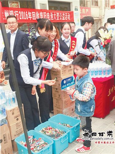 5月8日,由甘肅省委宣傳部、共青團(tuán)甘肅省委員會(huì)、省財(cái)政廳、甘肅日?qǐng)?bào)社、蘭州日?qǐng)?bào)社、蘭州銀行聯(lián)合開展的“共建美好家園——蘭州銀行2016年回收廢舊電池大型公益活動(dòng)”正式啟動(dòng)。本次活動(dòng)繼續(xù)以“關(guān)愛水源、關(guān)愛土地、關(guān)愛未來”為主題,按照活動(dòng)流程,自活動(dòng)啟動(dòng)之日起至6月8日,個(gè)人或團(tuán)體可帶廢舊電池在蘭州銀行省內(nèi)任一網(wǎng)點(diǎn)兌換同數(shù)量礦泉水。據(jù)統(tǒng)計(jì),活動(dòng)啟動(dòng)首日,蘭州銀行各網(wǎng)點(diǎn)回收廢舊電池25100枚,發(fā)放優(yōu)質(zhì)礦泉水24800瓶,受到市民的熱烈歡迎和高度評(píng)價(jià)。
