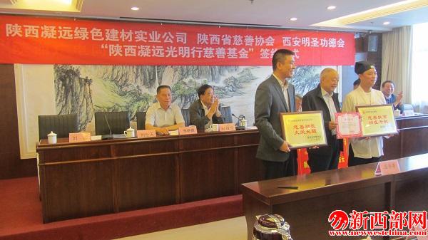 5月10日,陜西省慈善協(xié)會與陜西凝遠綠色建材實業(yè)有限公司、西安明圣功德會簽署建立“陜西凝遠光明行慈善基金”簽約儀式。省慈善協(xié)會終身名譽會長徐山林,省慈善協(xié)會名譽會長陸棟,省慈善協(xié)會會長劉維隆,省宗教事務(wù)局副局長李曉建,陜西凝遠綠色建材實業(yè)有限公司董事長劉洋,西安道教協(xié)會會長、西安明圣功德會會長劉世天等出席簽約儀式。副會長張文亮主持會議。