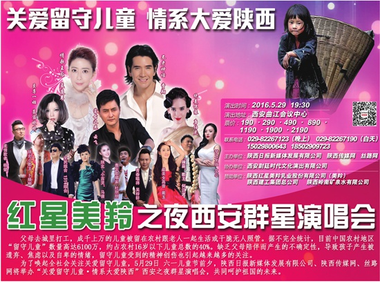 為了喚起全社會關注關愛留守兒童,5月29日六一兒童節(jié)前夕,陜西日報新媒體發(fā)展有限責任公司、陜西傳媒網(wǎng)、絲路網(wǎng)將舉辦“關愛留守兒童·情系大愛陜西”西安之夜群星演唱會,呼吁全社會共同呵護祖國的未來。屆時,華語樂壇“不老神話”費翔將攜手“月亮公主”孟庭葦為愛放歌。