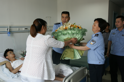 6月3日和4日,西安市公安局立即派相關(guān)負(fù)責(zé)同志與長安分局聯(lián)系,詳細(xì)了解案件及保安高敏受傷情況。同時(shí),治安局保安處處長張學(xué)林一行前往省武警醫(yī)院看望慰問受傷保安高敏。在武警醫(yī)院,張學(xué)林處長向醫(yī)生詳細(xì)詢問了保安高敏的傷情和搶救情況,希望醫(yī)院能用最好的醫(yī)療器械和藥物,竭盡全力治療,達(dá)到最佳的治療效果。同時(shí),張學(xué)林處長對(duì)受傷保安高敏勇斗歹徒、忠于職守、弘揚(yáng)保安正能量的精神給予了充分肯定,稱贊高敏同志是全市保安隊(duì)伍中涌現(xiàn)出的典型代表,高敏同志的事跡令人感動(dòng),崔人奮進(jìn),是全市廣大保安隊(duì)伍學(xué)習(xí)的榜樣和楷模。