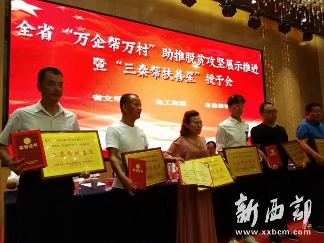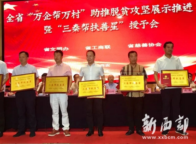 2018年9月4日,由陜西省文明辦、陜西省工商聯(lián)、陜西省慈善協(xié)會在西安舉行全省“萬企幫萬村”助推脫貧攻堅展示推進暨“三秦幫扶善星”授予會,隆重表彰在全省“萬企幫萬村”活動中做出貢獻的民營企業(yè)。陜西省委常委、統(tǒng)戰(zhàn)部部長姜鋒,陜西省慈善協(xié)會會長劉維隆,陜西省文明辦主任鮑貽勇,陜西省工商聯(lián)主席徐明非,陜西省慈善協(xié)會副會長張文亮出席會議并講話。