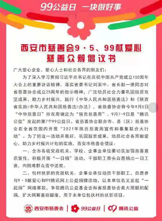 衛(wèi)冬梅對今年“9·9公益日”網(wǎng)上眾籌進(jìn)行了安排部署。 一、要提高認(rèn)識。今年9月5日,是第6個“中華慈善日”,9月7-9日,是“騰訊公益”發(fā)起的第七個9·9公益日,網(wǎng)上眾籌工作已經(jīng)從2015年的創(chuàng)新、嘗試發(fā)展到現(xiàn)在的全國慈善機(jī)構(gòu)、廣大國民都在積極參與的群眾性網(wǎng)絡(luò)慈善的大格局。我們必須從思想深處深刻認(rèn)識它的深遠(yuǎn)意義。我們慈善人,盡力把這件事情做好。 二、要查找短板。這幾年,西安市“9·9公益日”的網(wǎng)上眾籌,雖然做了很多工作,但與全省各市的差距是很大的,與省會城市的地位不相適應(yīng)。去年西安市網(wǎng)籌402萬元,排到全省第8位,確實差距太大。爭取今年 “9·9公益日”的網(wǎng)籌干出好成績。三、要廣泛宣傳?!?·9公益日”網(wǎng)上眾籌要做出成效,廣泛宣傳動員是關(guān)鍵。以市慈善會今年春節(jié)送溫暖的眾籌活動為例,由于利用各種形式宣傳動員,在半個月時間里,就眾籌善款330多萬;在援助河南水災(zāi)的行動中,市慈善會第一時間快速反應(yīng)發(fā)出倡議,全市全面動員,發(fā)揮愛心企業(yè)、商會的作用,線上線下并行,在10天的時間里,共籌集款物達(dá)1000余萬元,有效地馳援了河南的抗洪救災(zāi)。這說明網(wǎng)絡(luò)募集西安是有很大潛力的。今年“9·9公益日”西安市區(qū)縣慈善會要快速行動,全方位宣傳動員。不但要重點動員愛心企業(yè)、成功人士積極參與,而且要廣泛動員黨政機(jī)關(guān)、企事業(yè)單位和廣大群眾積極參與。不但要求得捐贈善款的最大值,而且要爭取參與群眾的廣泛性。參與人數(shù)越多,爭取配捐的系數(shù)就大,善款放大的效率就會更高。更重要的是慈善理念的宣傳教育效果就會更好。四、要加強(qiáng)領(lǐng)導(dǎo)。從這幾年省會以及兄弟城市的成功經(jīng)驗看,各級領(lǐng)導(dǎo)重視是做好9·5、“9·9公益日”的首要問題。所以,全市慈善組織的領(lǐng)導(dǎo)要從自身高度重視,按全市統(tǒng)一部署,把今年的9·5、9·9眾籌活動領(lǐng)導(dǎo)好、組織好。