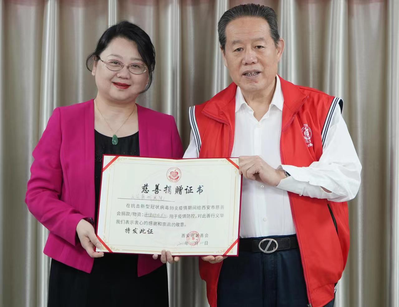 ▲鄭瑞世(左)代表唐城醫(yī)院向西安市慈善會遞交捐贈示意牌