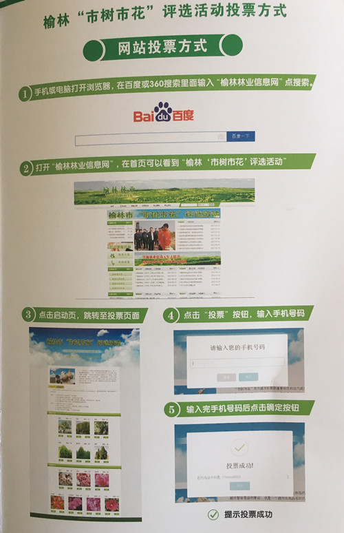 記者從發(fā)布會上獲悉,榆林“市樹市花”評選活動從2017年8月10日開始至2018年5月30結束,市民可登錄榆林林業(yè)網進行網絡投票(推薦候選市樹、市花附后,注明排名次序);也可通過“榆林市市樹市花評選”手機wap網頁進行投票;還可以填寫選票為自己喜歡的“市樹市花”投上寶貴的一票。2018年6月上旬,組委會辦公室將統(tǒng)計市民投票結果,報送評審組進行評審,選出榆林市的“市樹市花”。