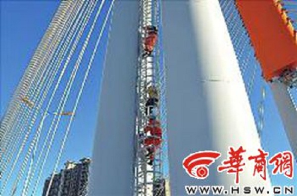 昨日下午,華商報記者特意來到朝陽橋上看到,大橋的中間位置兩側各有兩根高達60米的立柱,每側各有一根立柱上有通到橋頂?shù)呐逝婪鎏莅咽?,扶梯把手周圍有一圈保護網(wǎng)。但令人擔憂的是,扶梯距離地面只有1米多高,成年人伸手就可以夠到,并且可以輕松地攀爬上去。