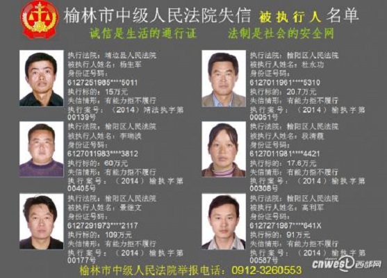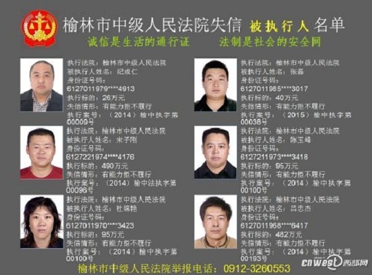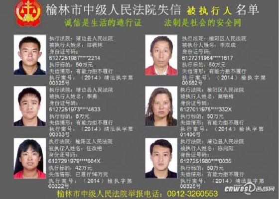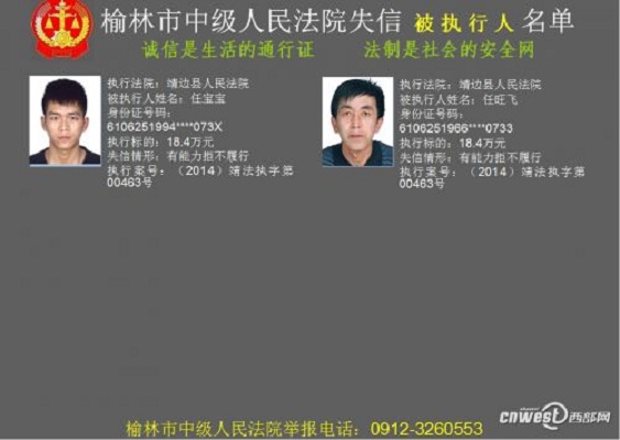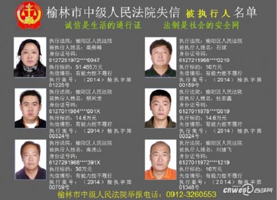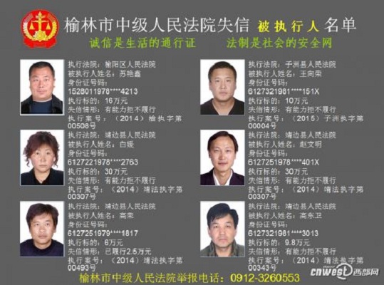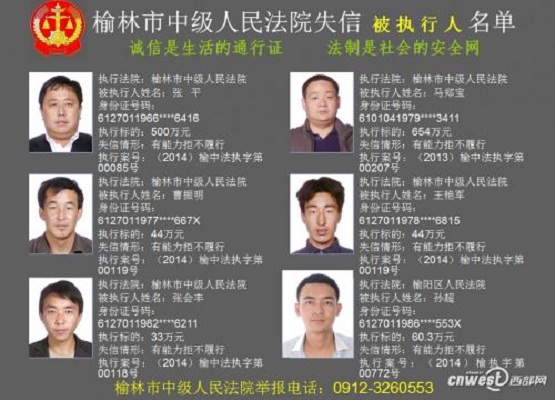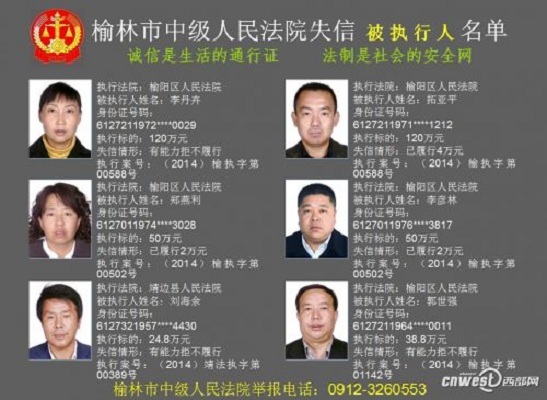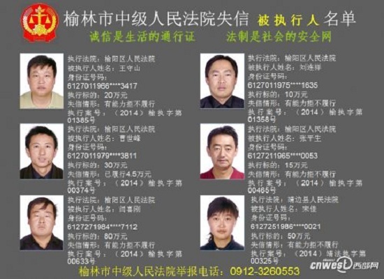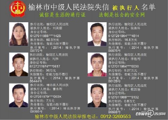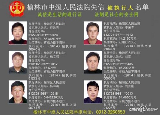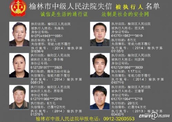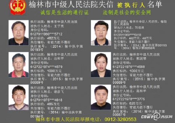 9月7日,記者從榆林市誠信“紅黑榜”第二次新聞發(fā)布會上了解到,失信被執(zhí)行人信息,將通過媒體、微博、微信、戶外宣傳欄、金融機(jī)構(gòu)演示屏等媒介全面曝光,并向所有失信被執(zhí)行人發(fā)出限制高消費(fèi)令。同時向社會發(fā)布第三批,共80名失信被執(zhí)行人信息。至此,榆林今年共發(fā)布三批次、共225名失信被執(zhí)行人(俗稱“老賴”)信息。
